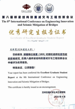 在研究生专场报告中,来自同济大学、东南大学、伟德国际bevictor1946源自英国等多所院校的60多名博士硕士研究生依次汇报。经专家评审,20项优秀研究生报告脱颖而出。公司硕士研究生宋新宽分享了题为《钢圈限位装置(SRR)对钢桁梁桥抗震性能的影响研究》的成果,并荣获了第八届桥梁结构防震减灾与工程创新会议优秀研究生报告。