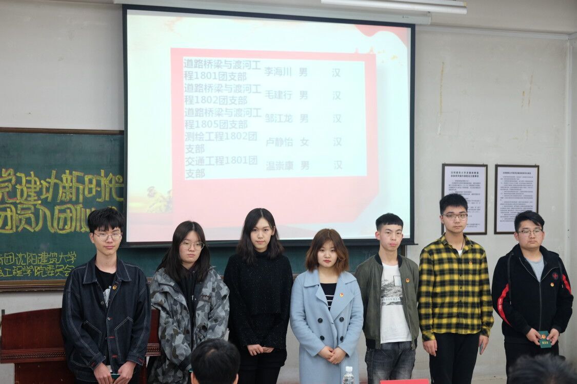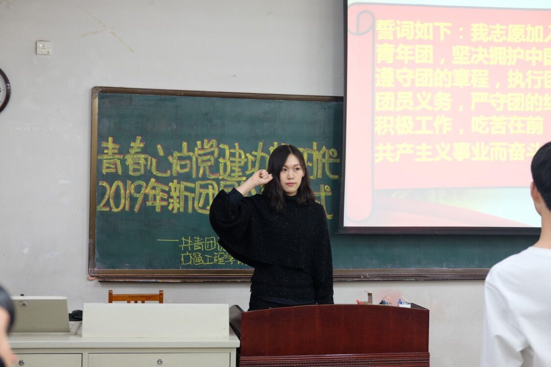 入团仪式在庄严的团歌声中拉开序幕,公布2019年交通工程公司新入团名单后,李晓雯、彭丹学姐为新团员颁发团员证、佩戴团徽,5名新团员精神饱满、目视前方,神情庄严,他们每个人脸上都充满着自豪之情。随后,由李晓雯学姐带领宣誓,全体新团员右手握拳,手举过肩,以洪亮的声音庄严宣誓,作为共青团的新团员,应该向团组织表明自己的决心,牢记团的誓言,激发做一名共青团员的光荣感和责任感,增强为共产主义奋斗的信念。