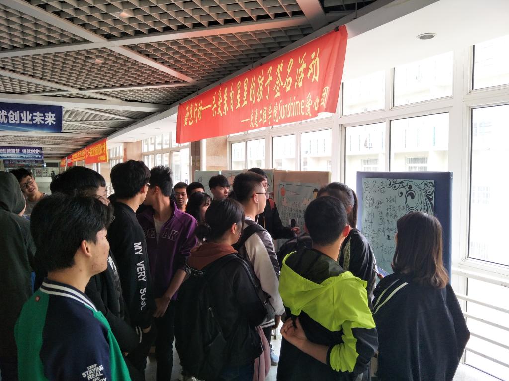 为了活动顺利进行,志愿者与宣传部成员们在活动前期精心准备了展板及宣传板报介绍当前自闭症患者的情况以及有关自闭症的信息。下午一点,活动成员在长廊对“来自星星的孩子们”的生活状况和行为表现以及我们该如何正确看待并帮助“来自星星的孩子”进行讲解和宣传,以此让同学们能够切身感受“来自星星的孩子”的内心世界。参加此次活动的同学在活动最后通过签名、合影留念来纪念此次活动。