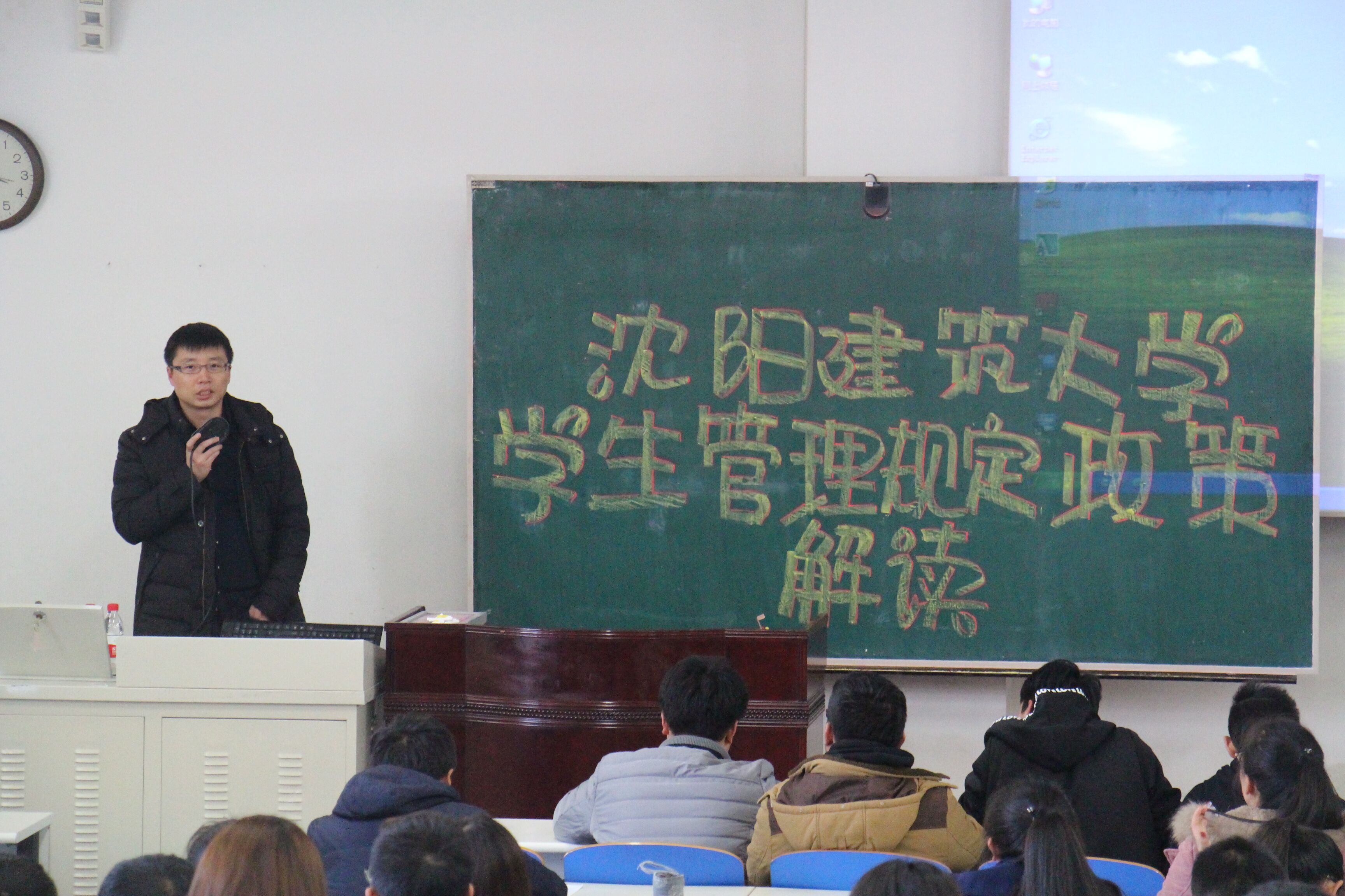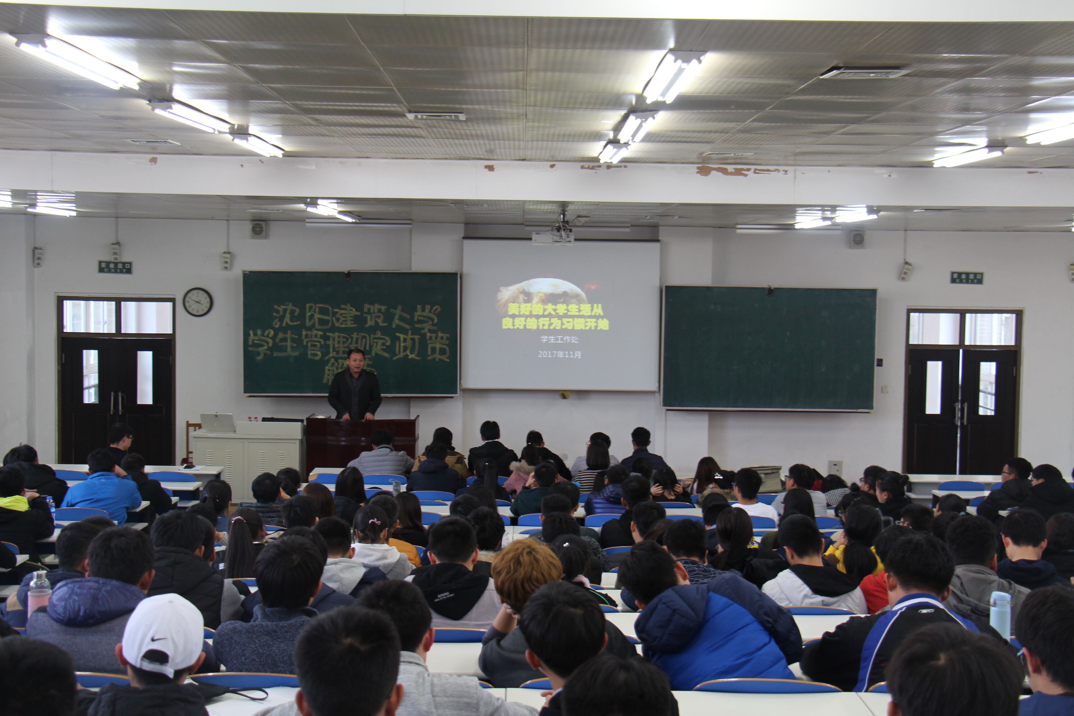 11月3日下午,交通工程公司在甲1-401教室开展员工管理规定政策解读讲座,员工处副处长赵浩轩主讲。17级辅导员肖祖鹏及17级新生近300人参加了讲座。