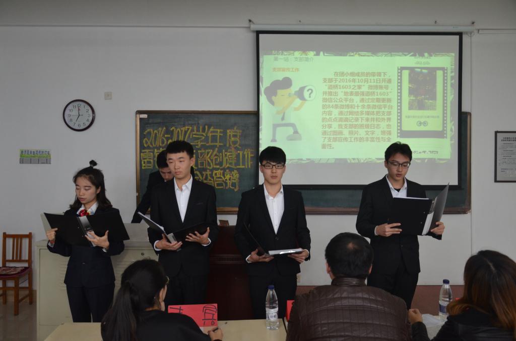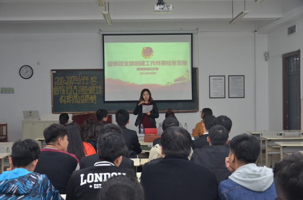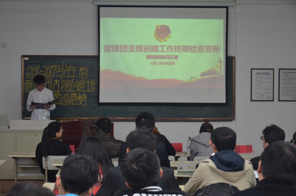 10月31日晚,交通工程公司在C3-306教室举办2016-2017雷锋团支部创建工作终期检查答辩,交通工程公司团委书记、学办主任肖祖鹏,15级辅导员刘伊娜,16级兼职辅导员汤楚桐,分团委副书记李馨蕊、姜金宏及16级、17级各团支部成员代表50余人参加了本次答辩。