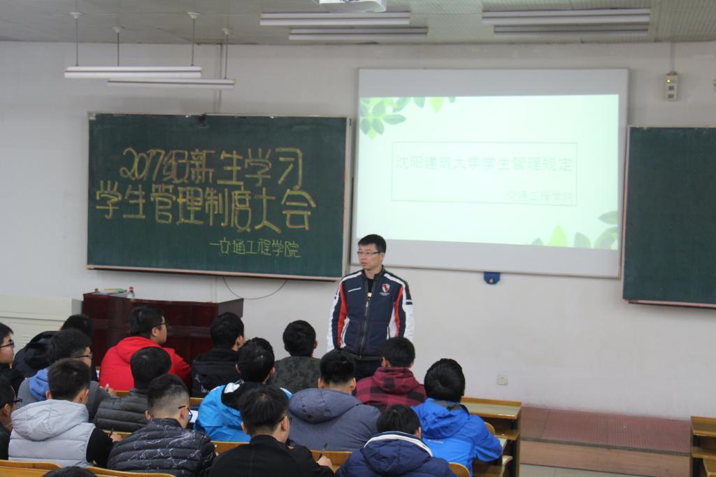 10月24日下午,交通工程公司在B2-201教室举办2017级新生学习员工管理制度大会。17级新生辅导员肖祖鹏、14级辅导员李依默以及全体17级新生共计200余人参加了本次大会。